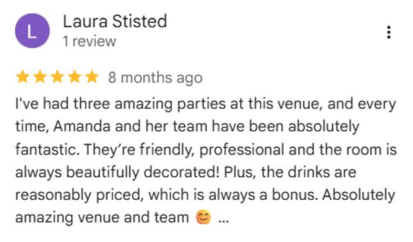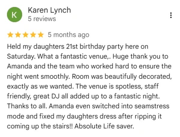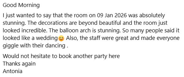 Our latest review from a delighted customer who had their 40th Birthday party here in January 2026!