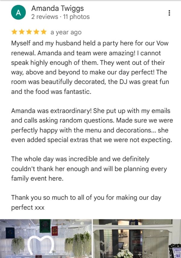 Click the link below to take you to this wonderful review from a couple who had a party to renew their vows!