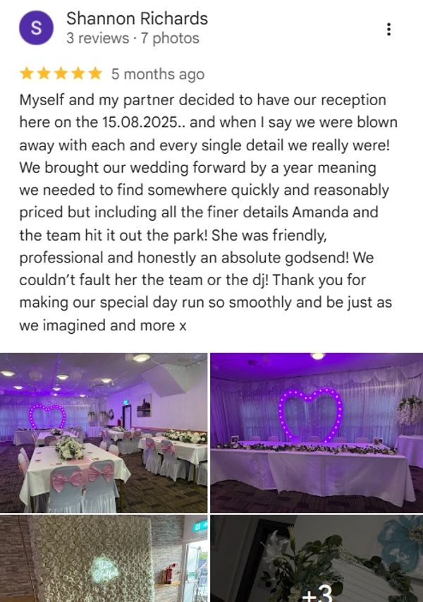 Check out this fabulous 5* review! Click on the link below to take you to the live review on Google Maps. We have a high demand for weddings in the summer, so call today to book your special day with us. Our prices are incredibly competitive and your guests will have the best day too, as our drinks are at great prices too!